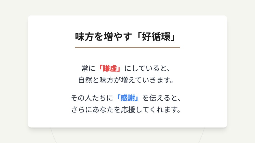 このシンプルな循環が、気がつけば強固な信頼関係を作り上げ、あなたの周りにたくさんの味方を増やしてくれます。