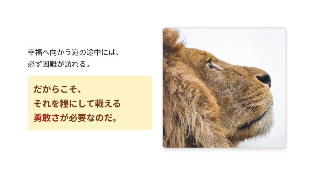 だからこそ、困難が来た時に、これは自分が試されているんだ、これを乗り越えればもっと強くなれる、と捉える勇敢さが必要です。